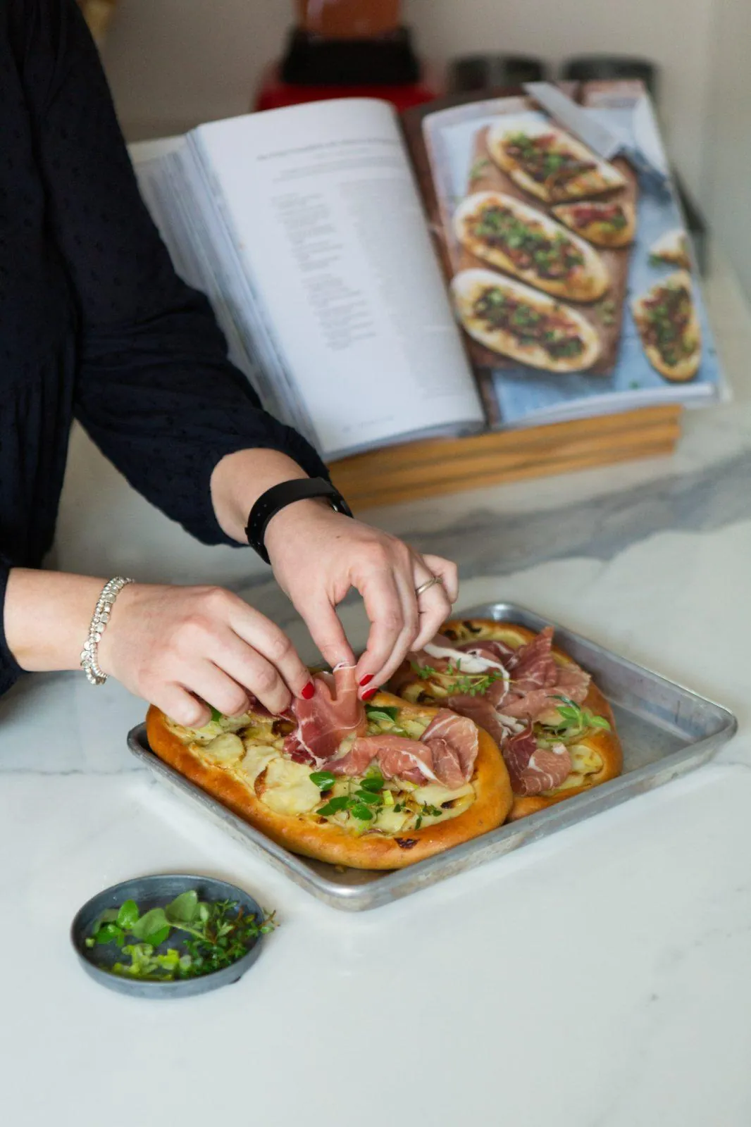 La ricetta di queste pissaladière è molto più facile di quanto non si possa pensare, è un lievitato adattissimo a chi è alle prime armi, richiede solo lievito di birra secco (ma la prossima volta voglio provare con quello fresco!) e se non avete l'impastatrice oltre a suggerirvi caldamente di comprare una della gamma di KitchenAid perchè sono davvero un grande aiuto in cucina, potete dedicarvi anche a impastare a mano, ci vorrà più tempo e più fatica ovviamente. Non ho cambiato granchè nella ricetta se non alcuni passaggi nel procedimento; in particolare ho preferito unire l'olio verso la fine nell'impasto, dal momento che ho usato l'impastatrice, e ho preferito mettere il prosciutto crudo a fine cottura. Ho usato olio italiano e prosciutto di parma al posto del prosciutto spagnolo e l'olio francese segnalati in ricetta perchè mi piaceva l'idea di usare prodotti più local per realizzare queste pissaladière in versione italiana, e ho usato le erbe aromatiche che avevo a disposizione, quindi origano e timo, al posto di quelle segnalate sul libro. Per il resto che dire, le pissaladière sono perfette sia come piatto principale, così come abbiamo fatto noi in questa puntata primaverile di The Cooks Club, ma tagliate a fettine più piccole fanno la loro figura anche in un buffet per un aperitivo o una cena in piedi!