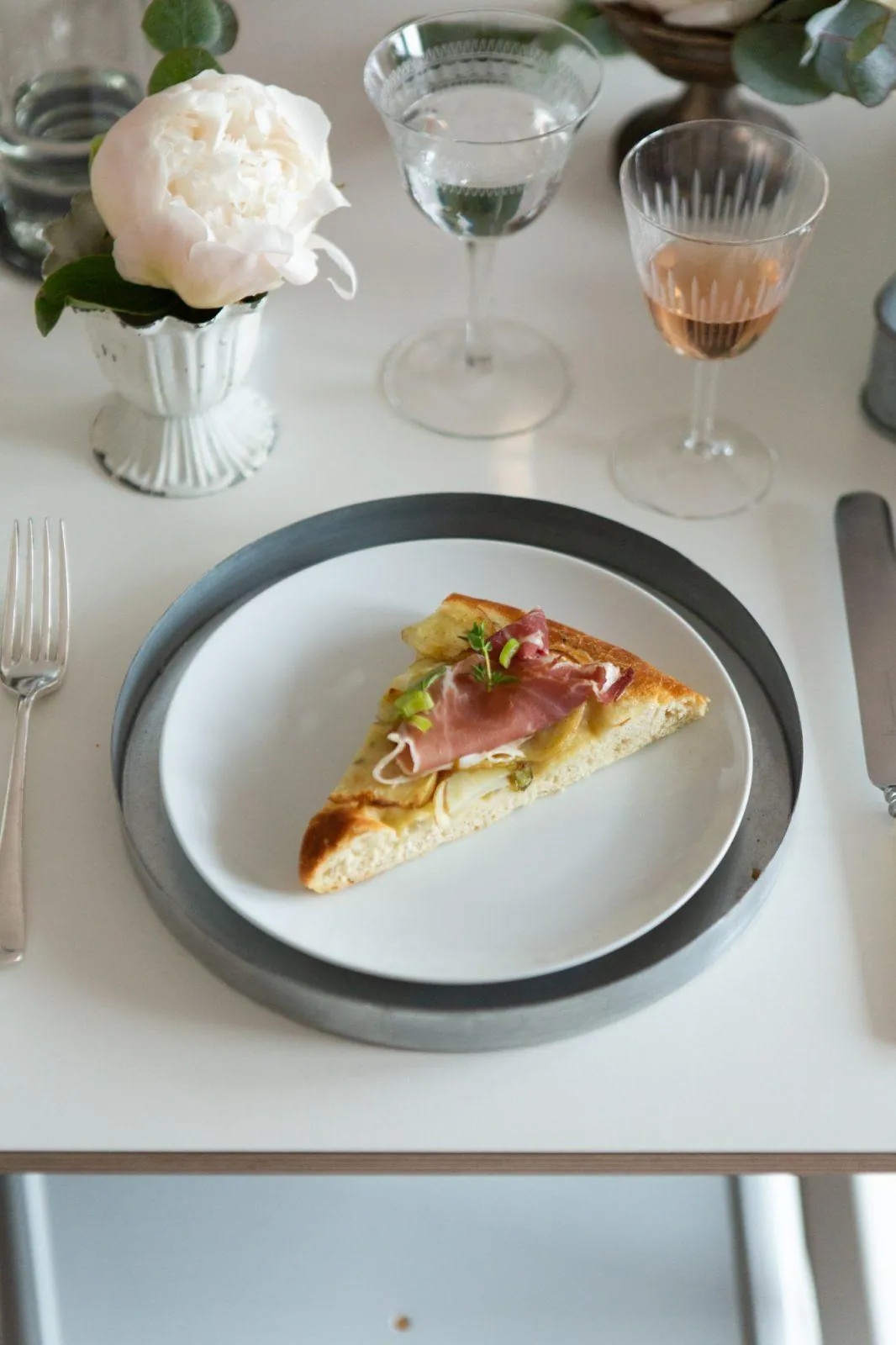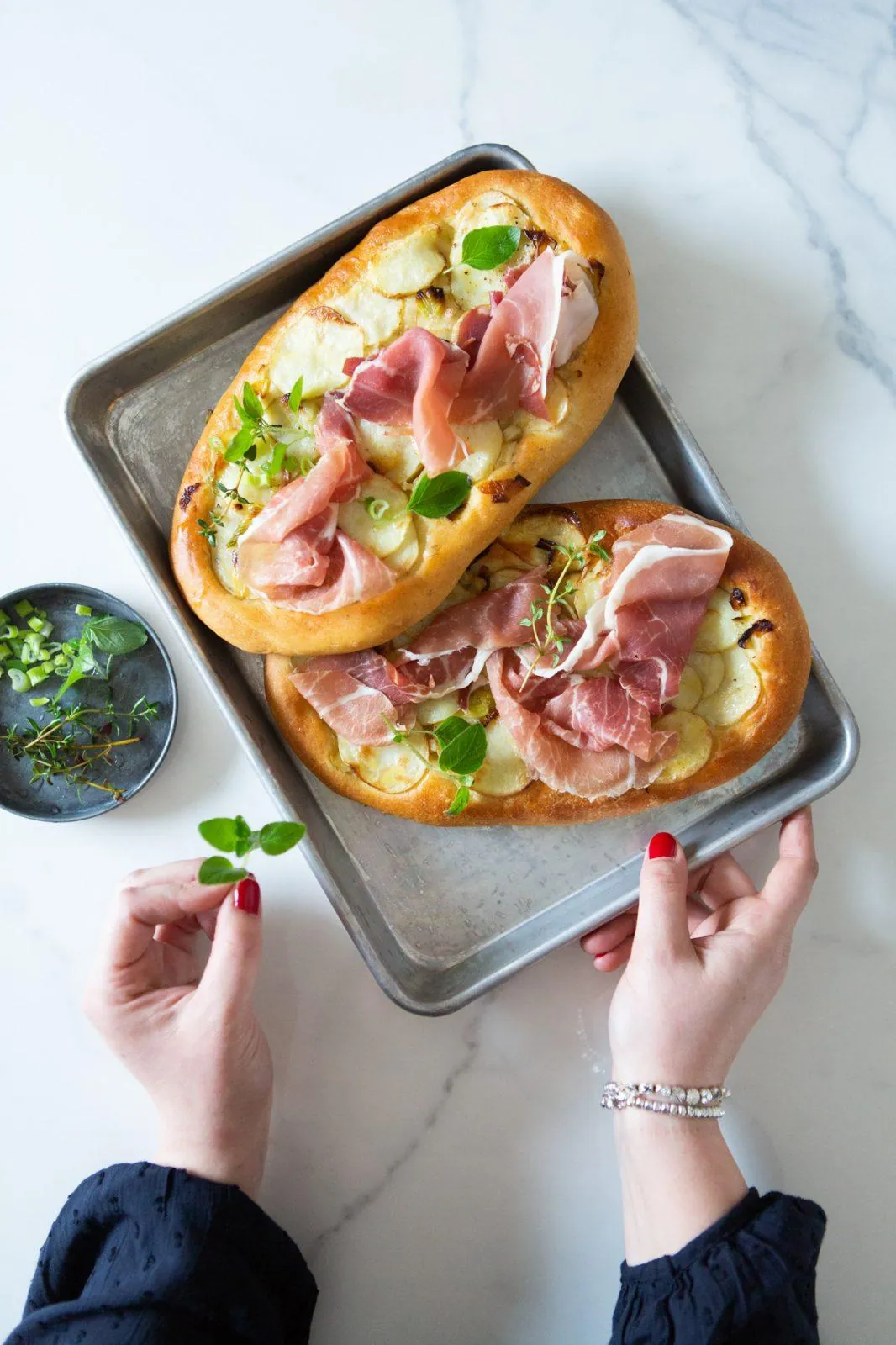 Pissaladière alle patate novelle, erbe aromatiche e prosciutto
