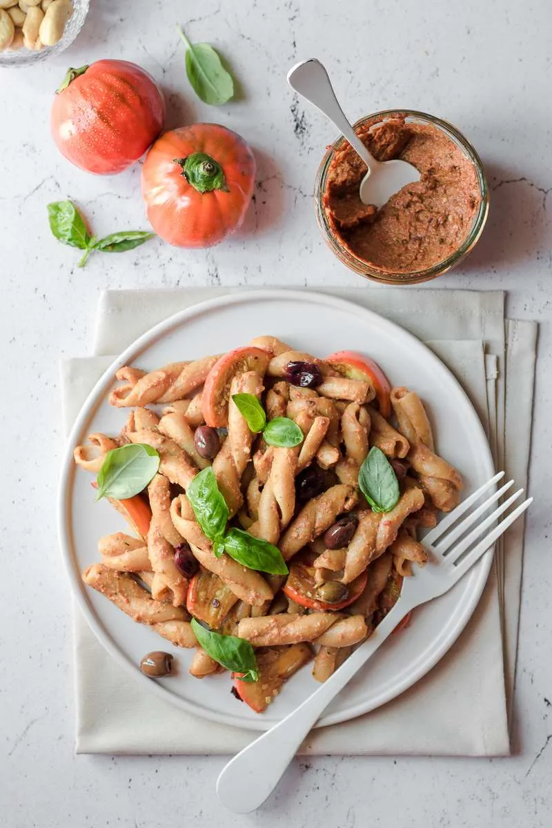 Cuocete la pasta in abbondante acqua salata, condite con il pesto rosso allungato con un po' di acqua di cottura, aggiungete le melanzane rimaste qualche oliva e il basilico e servite