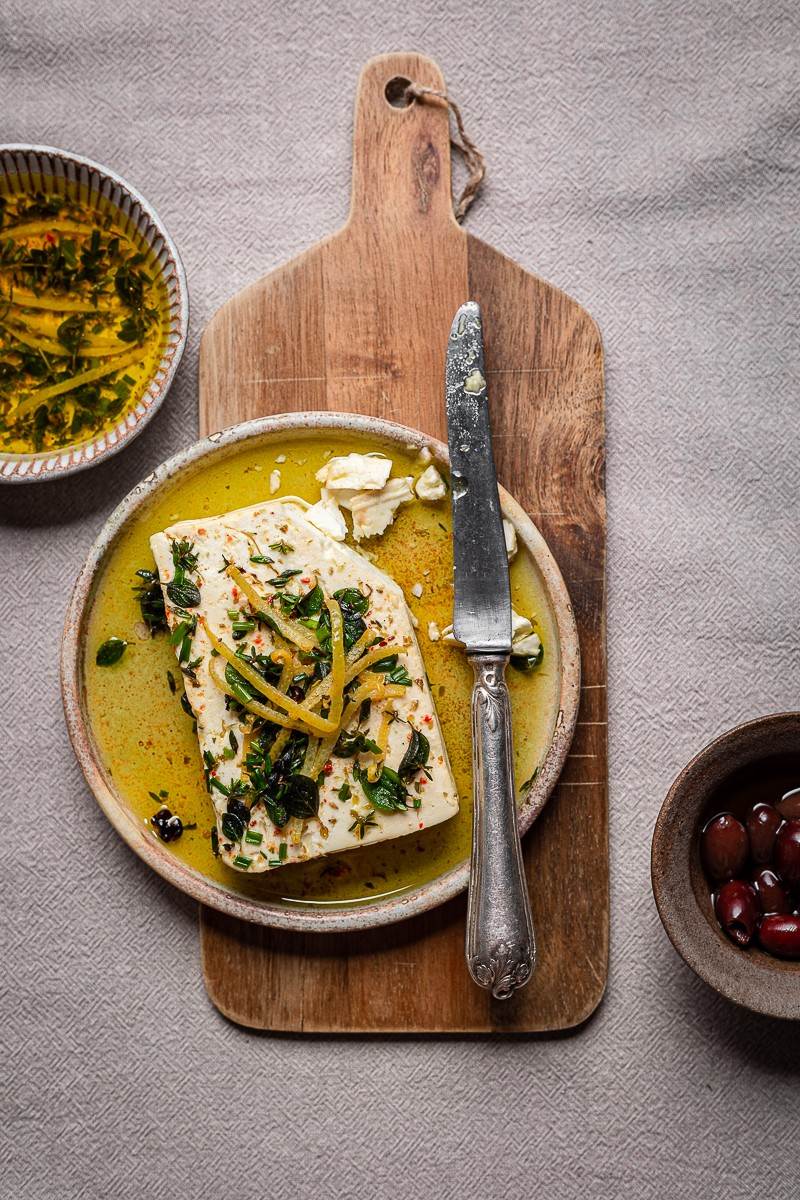 - Versate l’olio e gli aromi sulla feta e poi aggiungete olio quanto basta per coprire uniformemente il formaggio.