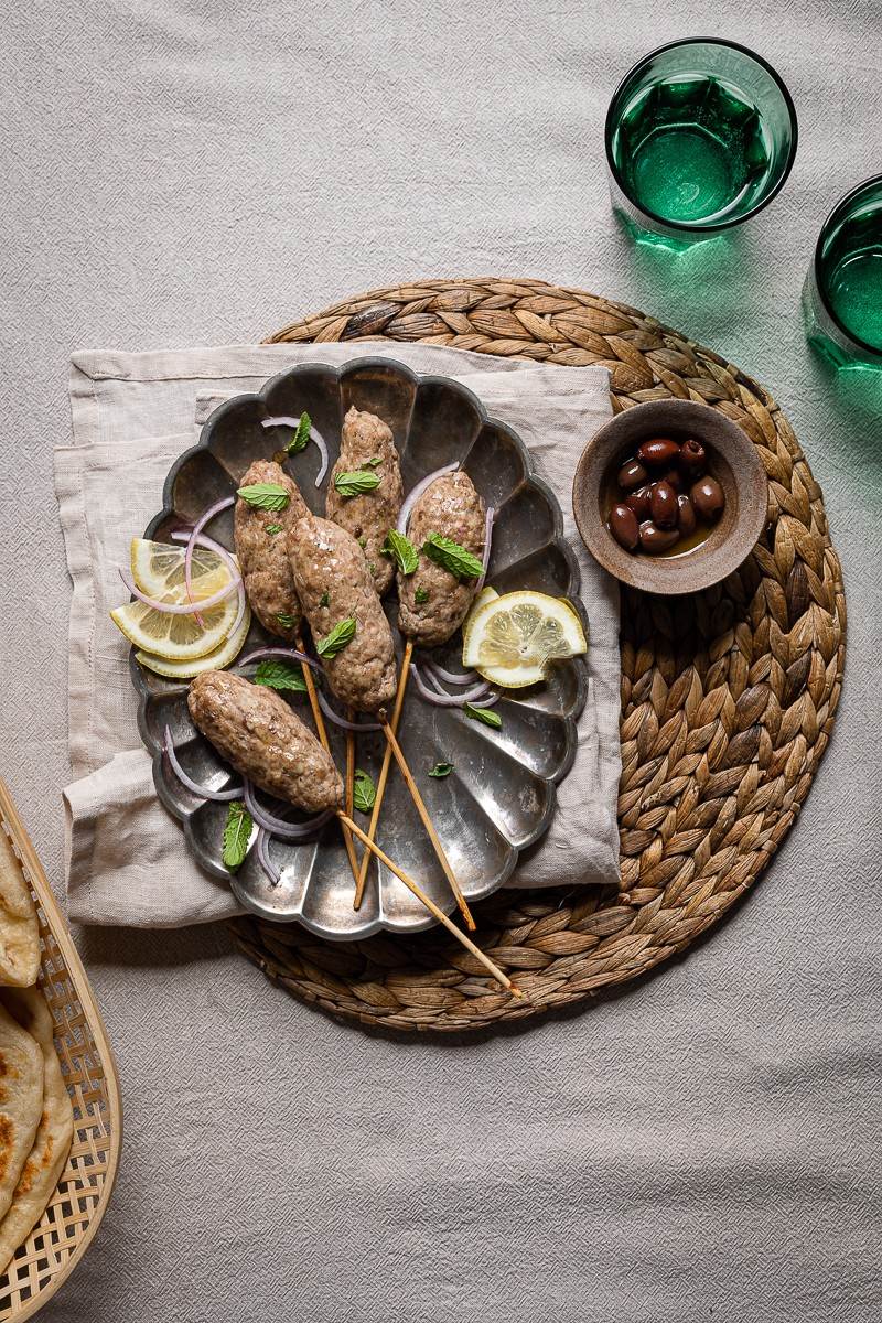 Le kofta di carne sono delle polpette di macinato avvolte su spiedini di legno o metallo e cotte sulla griglia, una versione insomma più veloce del classico gyors. Tradizionalmente la carne utilizzata è un trito d'agnello, saporito, gustoso e ben grasso, purtroppo però introvabile in Italia - anche in periodo Pasquale, figurati in agosto - quindi ho cercato una carne che ne potesse essere un valido sostituto. Una carne di manzo macinata non troppo magra può funzionare adeguatamente ma io ho deciso di utilizzare il maiale per mimare consistenza e grassezza. Non sono sicura che un greco approverebbe, sono onesta, ma mi sono basata sul fatto che la carne di maiale è molto diffusa in Grecia anche per altri piatti tra cui, ovviamente, il tradizionale gyros, che appunto si differenzia dal kebab turco o di quella zona geografica e culturale proprio perché a base di maiale (ovviamente escluso invece dai piatti arabi). Sconsiglio di usare carni magre, sia di maiale che di manzo ma soprattutto di vitello e pollame, perché vi ritrovereste con delle kofta dure e secche. Non dimenticatevi la menta tritata e le spezie, sono quelle a fare la differenza! Se non avete quelle che ho usato io potete usare anche il cumino, il ras el hanout, o un mix di spezie per gyros o per couscous.
