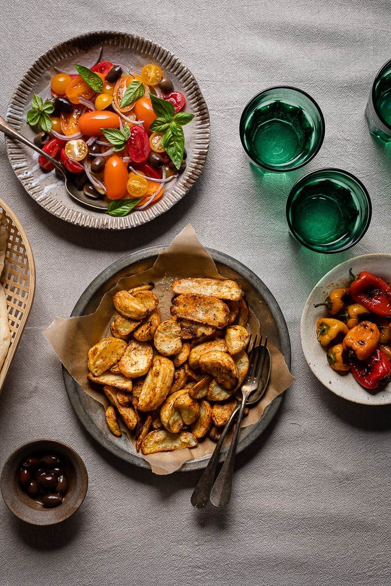 Io ho servito come contorni patate arrosto, peperoni saltati e un'insalata semplice di pomodori, olive e cipolla rossa, ma ecco qualche altra idea per la vostra pita party: