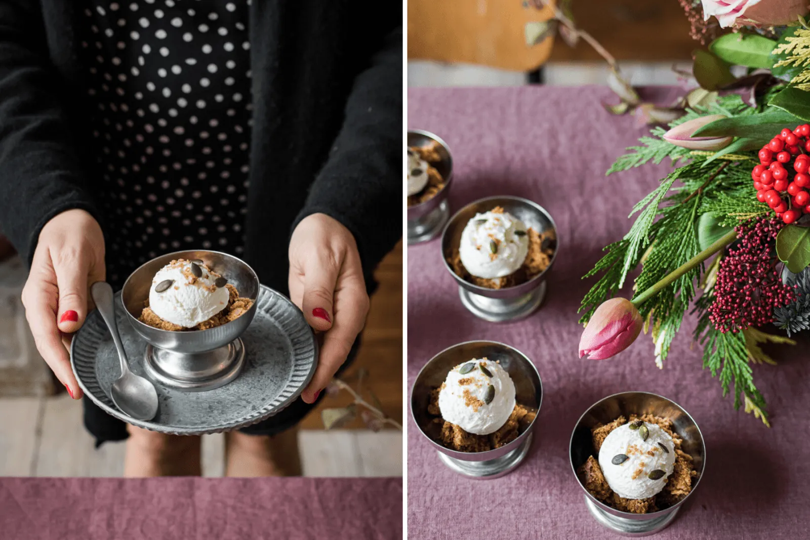 Lidia invece ha preparato un cake di frutta secca che ha servito in delle bellissime coppe con una pallina di gelato al marron glacè (io ho un debole per i marron glacè!) che penso sia stato uno dei dolci più buoni mai mangiati, e un'ottima idea per rendere più elegante un banale cake al forno