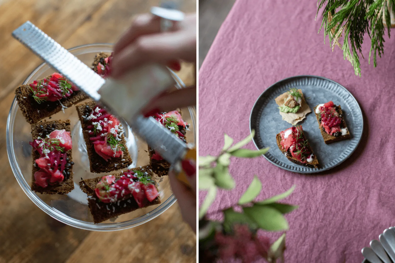 Quarto e ultimo appuntamento per #TheCooksClub, un aperitivo tra amici per brindare al Natale con tartine di pane nero con carpaccio, barbabietola e lenticchie beluga, tratte da Un Gusto Diverso di Diana Henry